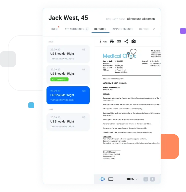 Leverage our built-in voice recognition technology or integrate your preferred engine like Dragon Medical One or 3MTM M*Modal Fluency Direct. This flexibility allows for swift report generation without the need for typists, ensuring instant report delivery for faster turnaround and improved patient care.